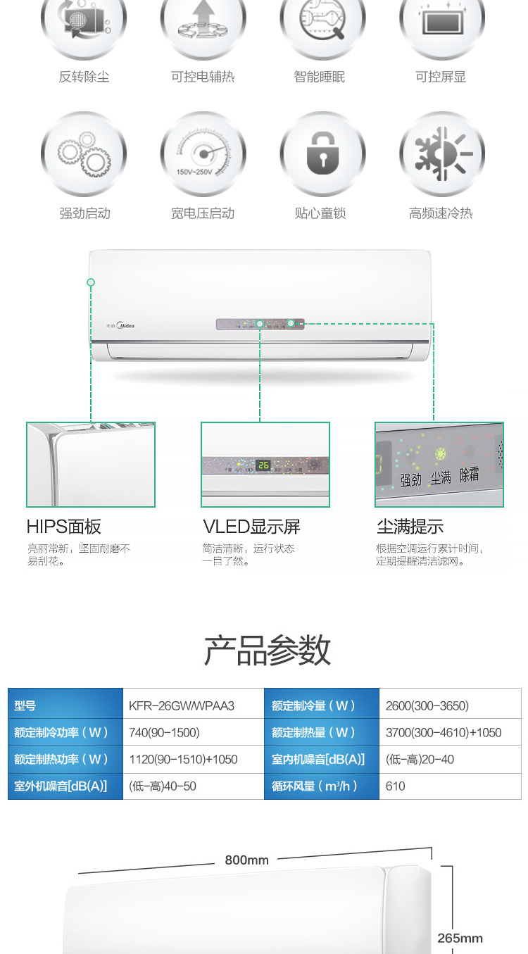美的(Midea)大1匹 京东英雄壁挂式冷暖变频空调KFR-26GW/WPAA3 白色 正1.5匹