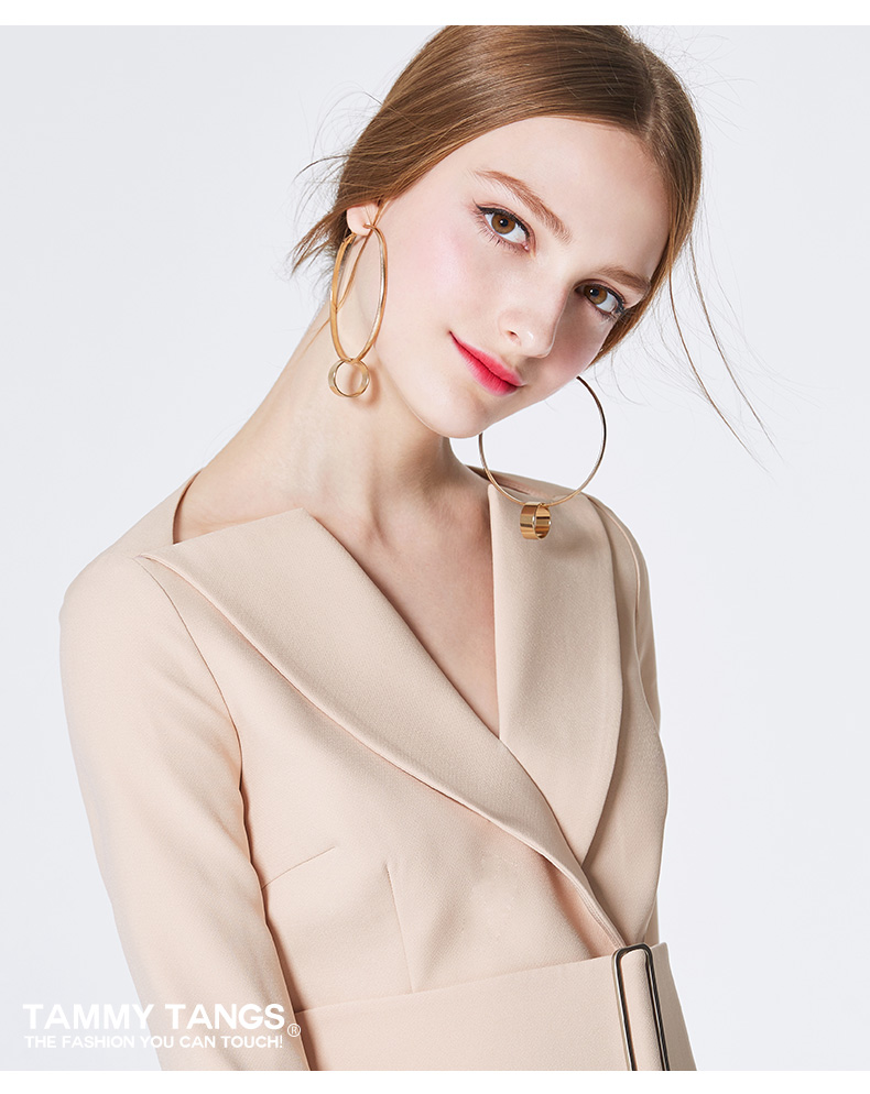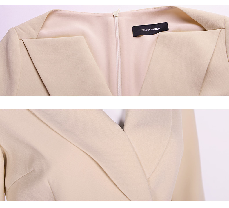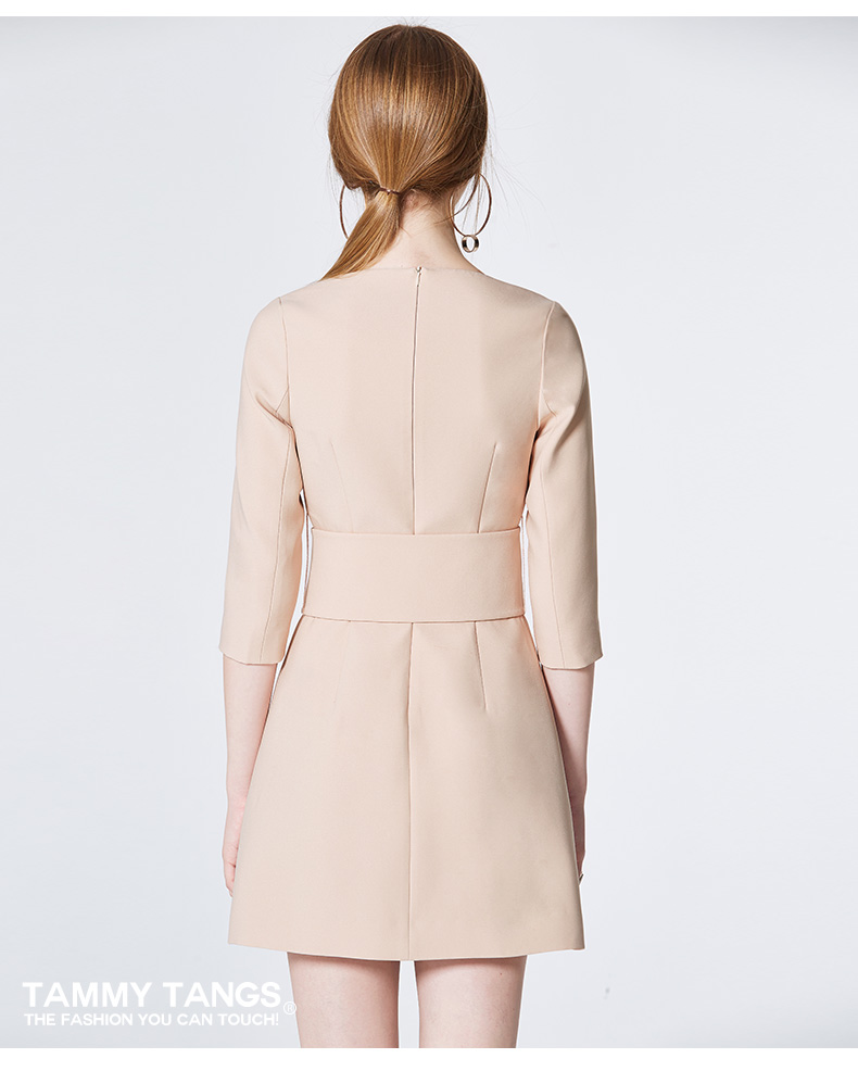 糖力2017春装新款欧美 女装裸色五分袖收腰连衣裙显瘦裙子 裸色 杏色 XL